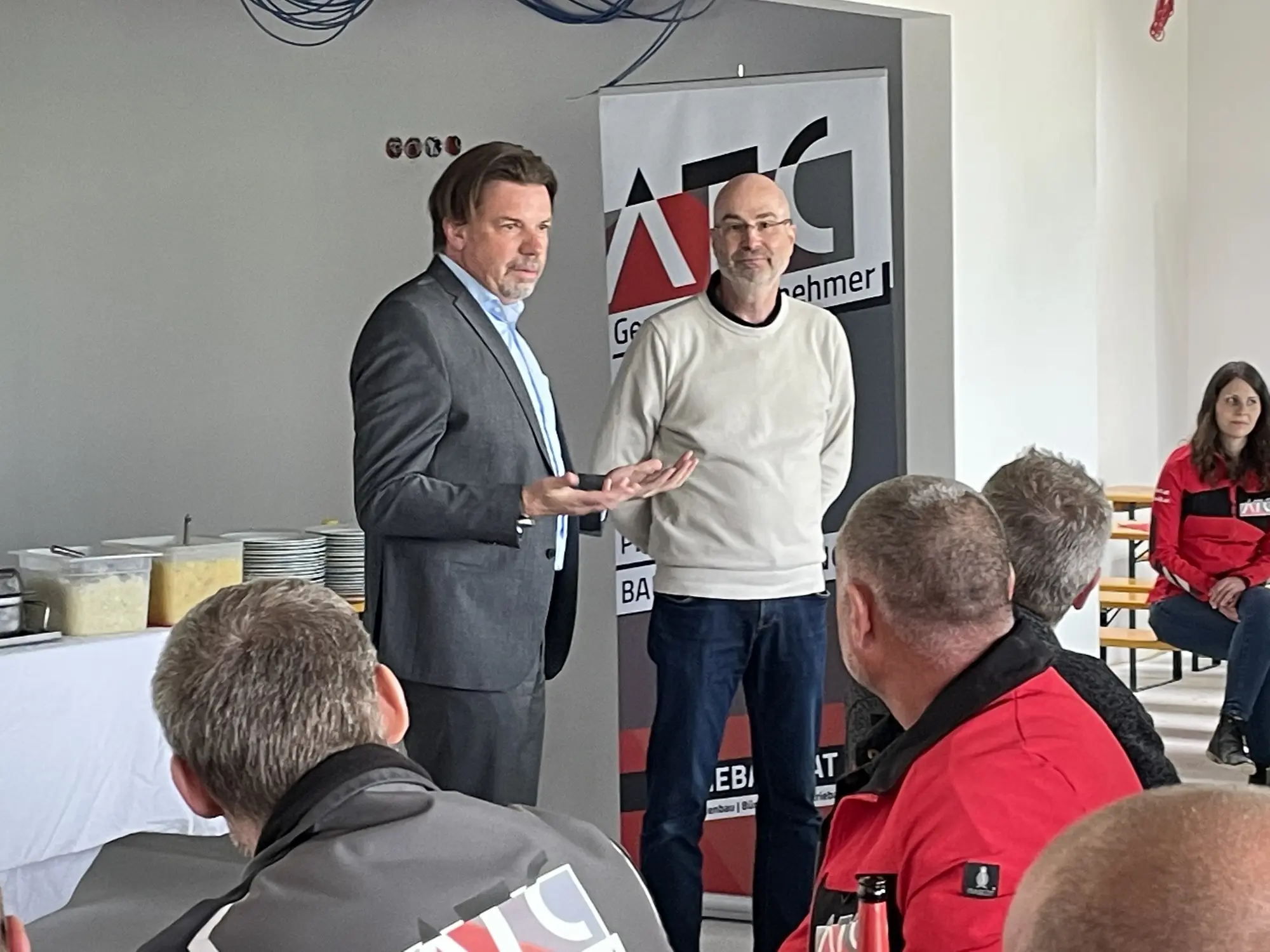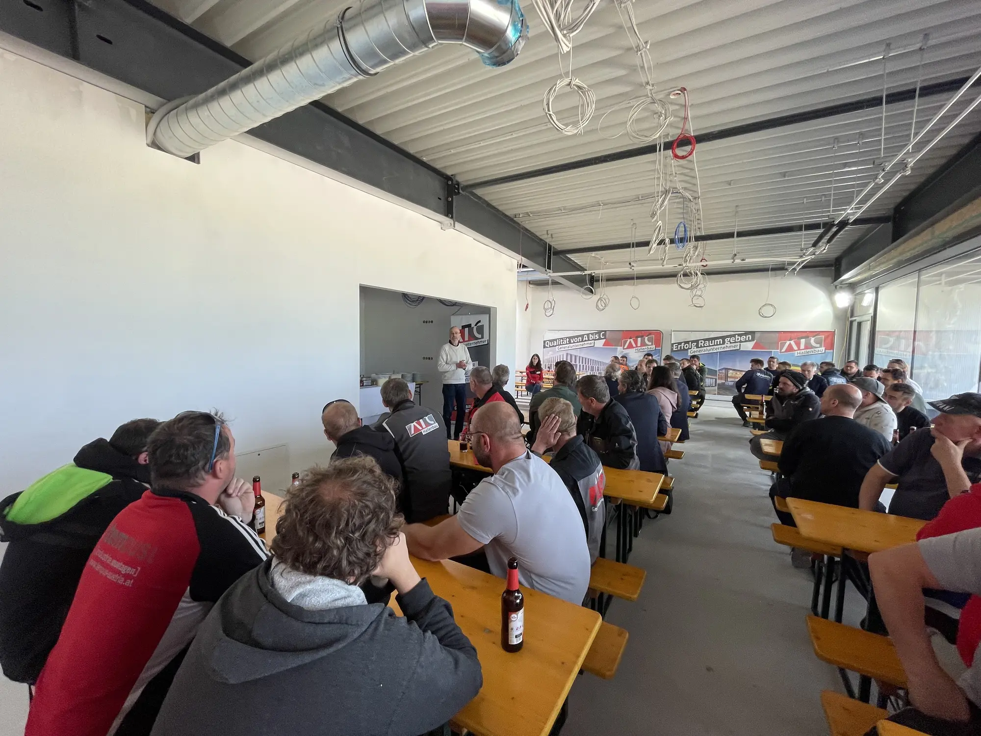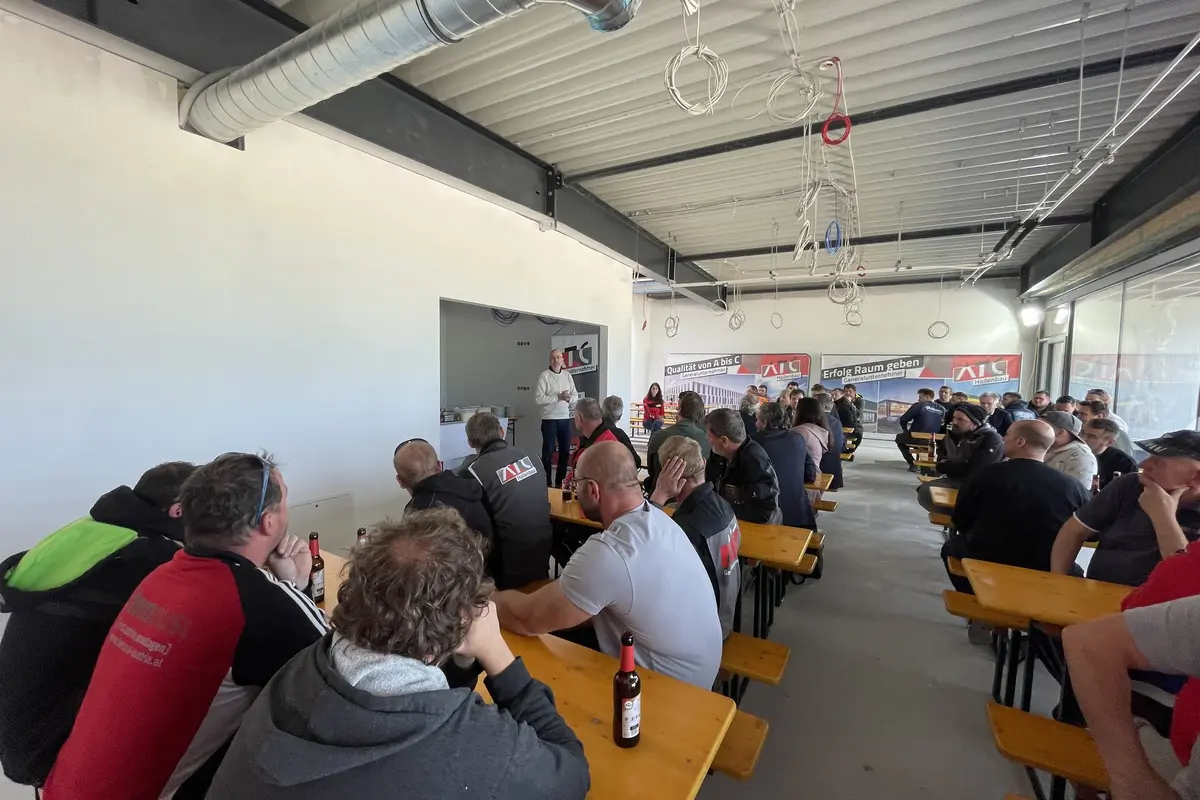 Sechs Monate nach der Grundsteinlegung der binca manufaktur in Perschling, konnte ATC Generalunternehmungen zur Gleichenfeier laden. 70 Gäste, darunter die beiden Hausherren Oliver Fritsch und Walter Rittinghaus, sowie zahlreiche Mitarbeiter*innen von Subunternehmen verbrachten einen geselligen Abend im Obergeschoss des Neubaus und feierten den Baustellenfortschritt.