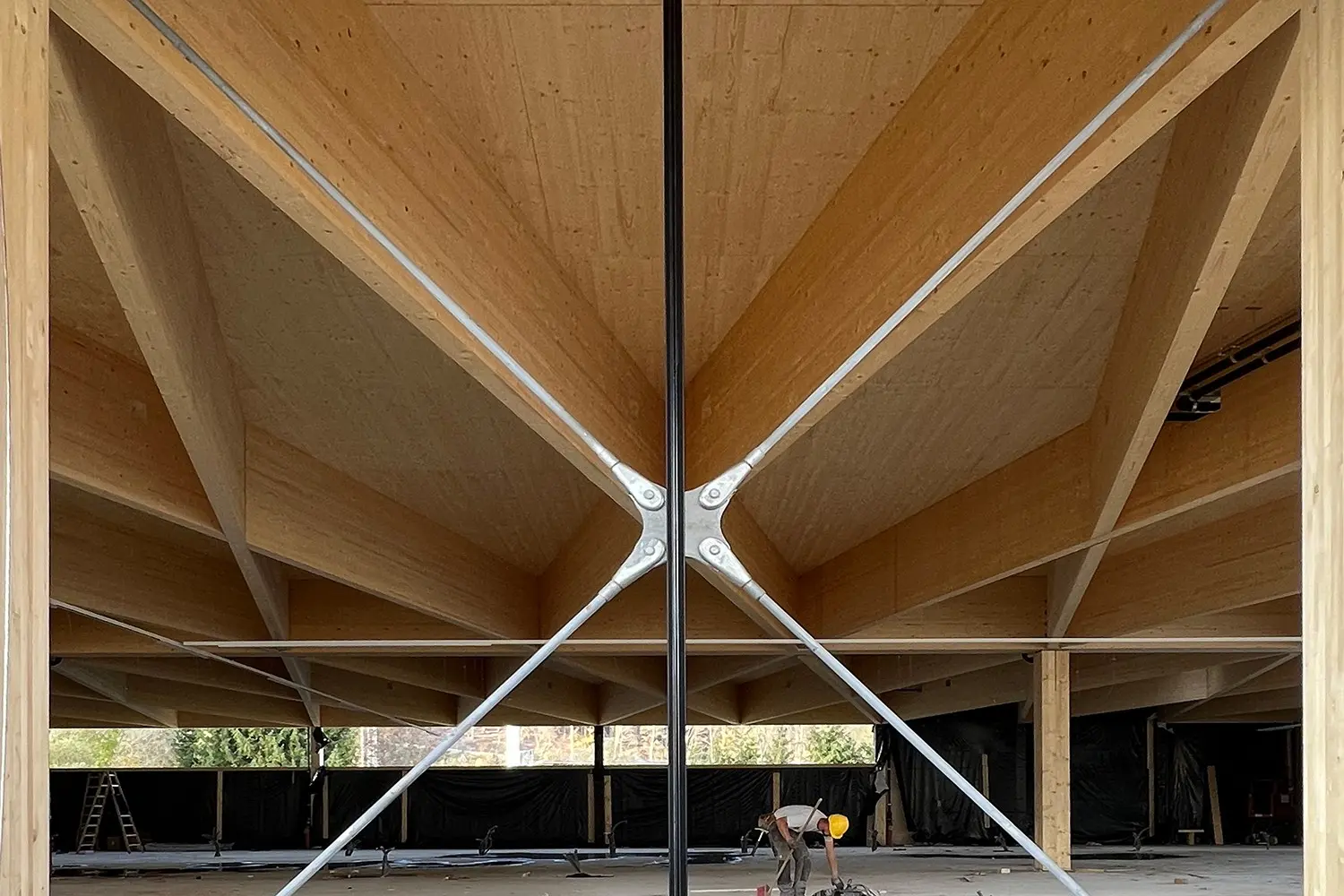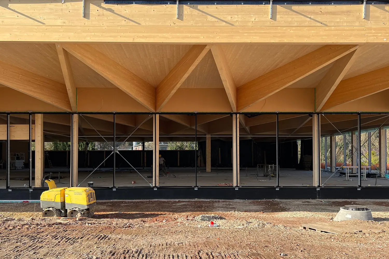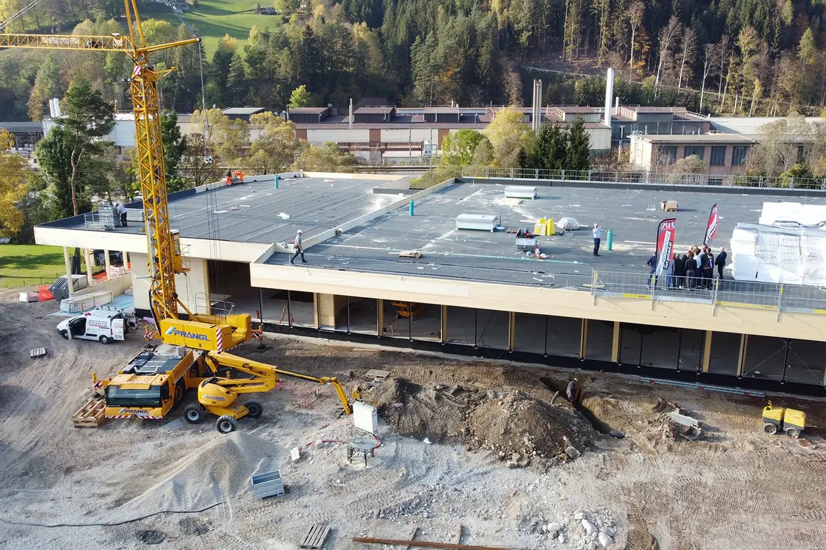 Nach der Theorie kam die Praxis und wir besuchten eine aktuelle Baustelle der ATC Holzbau. In Hönigsberg (Mürzzuschlag) erklärten uns Stefan Inschlag wie der neue Eurospar-Markt auf einer verbauten Fläche von rund 2700 m² im reinen Holzbau verwirklicht wird und was die Besonderheiten bei der Ausführung sind. Dabei wurden unterschiedliche Holzbausysteme verbaut.