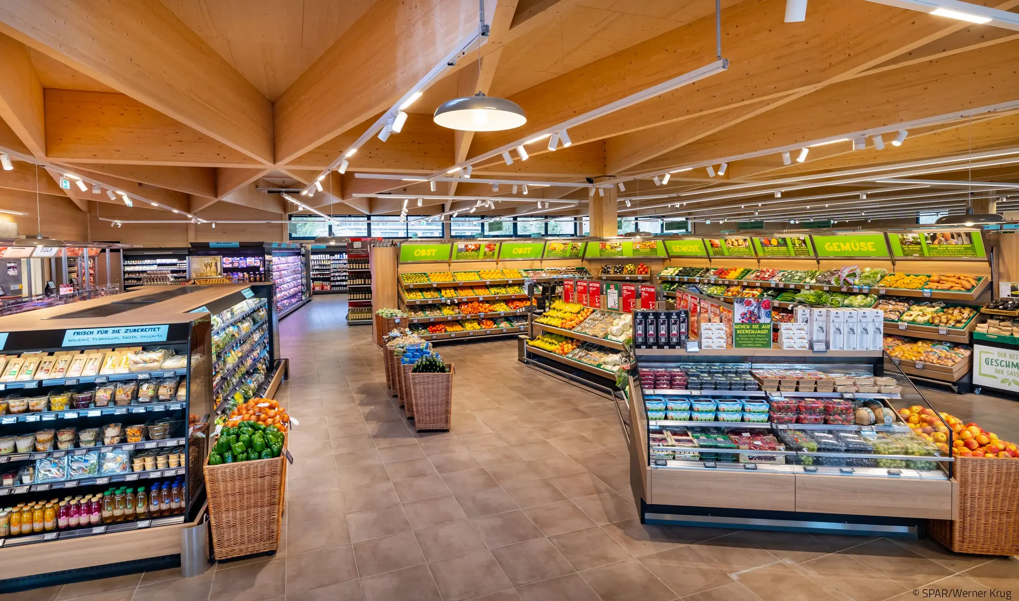 So geht Nachhaltigkeit: LED-Beleuchtung, Wärmerückgewinnung, Photovoltaikanlage, Holzbau. Die Dachkonstruktion besteht aus einem rautenförmigen Flächentragwerk mit Hohlkastenelementen in Sichtqualität. Wände & Stützen sowie Teilbereiche der Fassade wurden ebenso mit Holz ausgeführt. Das verbaute Holzvolumen von rund 650 m³ speichert in etwa ebenso viele Tonnen CO2.
